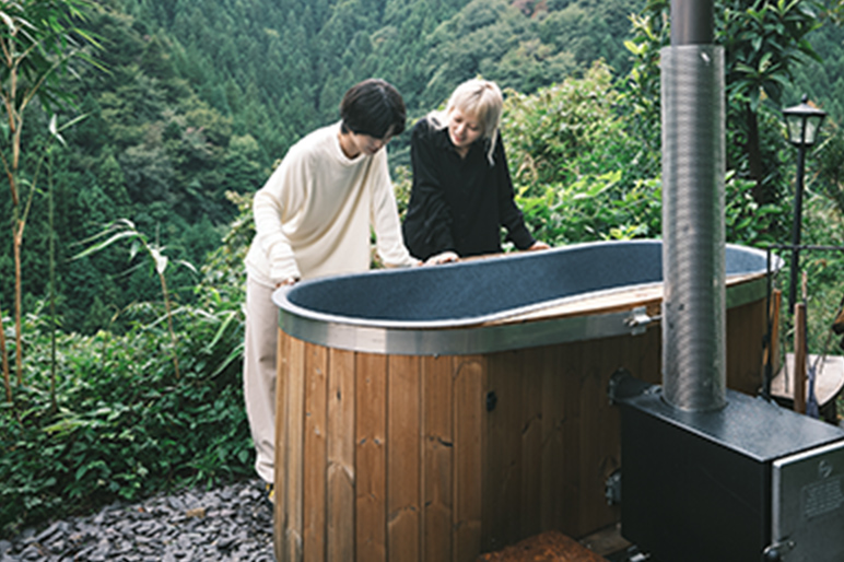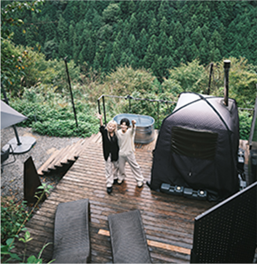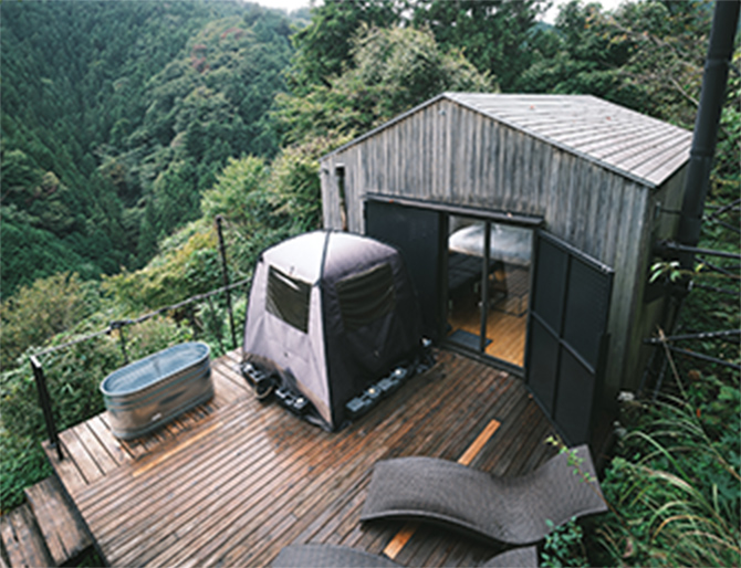 客室の外には、テントサウナと水風呂、露天薪風呂まである豪華ぶり。「できるだけ自然に近いもので」というこだわりから、サウナもお風呂も薪で温め、水は湧水を使用しています。