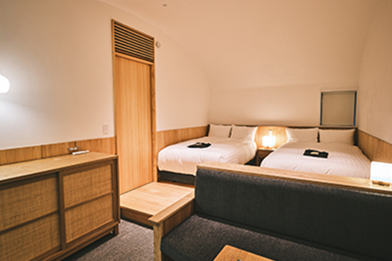 15時になったら早速チェックイン。客室の天井はアーチ状にカーブし、まるで繭に包み込まれるような安心感。ベッドもソファも、ベランダの椅子も外が見えるように設置されていて、室内でもいつでも自然を感じられます。