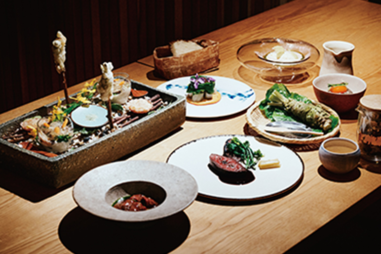 気になるお食事は、2階のレストラン「時帰路(TOKIRO)」でいただけます。地域で有名な東京和牛やヤマメなどをメインにしつつも、庭で収穫された食材や山菜など、旬をふんだんに盛り込んだお料理。その季節、その時ならではの食事を楽しめます。
