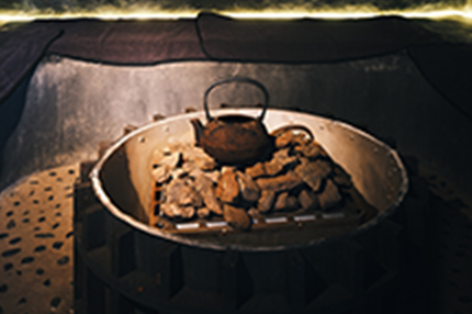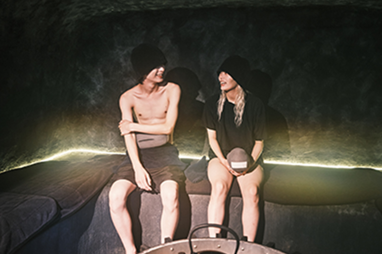 早速入ってみると、中はまるで洞窟のよう。木のサウナとの大きな違いは、その「過ごしやすさ」。土に蓄熱された熱を浴びるため、「熱っ!」という痛々しさがなく呼吸がしやすいのもポイントです。からだにやさしい温まり方で、わいわい会話を楽しみながら過ごすことができます。