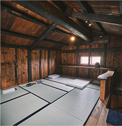 部屋に入ると、気持ちのいい畳が広がります。築150年の古民家にあった柱や畳を最大限生かした、どこか懐かしい雰囲気に心がほっと落ち着く空間。