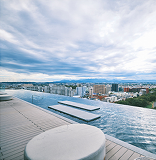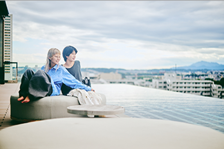 チェックイン後、早速訪れたのは11階。そこに広がるのは、まるで空と一体化したような「インフィニティプール」です。青空と目の前に広がる昭和記念公園の自然、そして天気が良ければ富士山が見えることも。そんな景色に思わず「あれ、ここ東京だっけ?」と声が漏れ出てしまいます。
