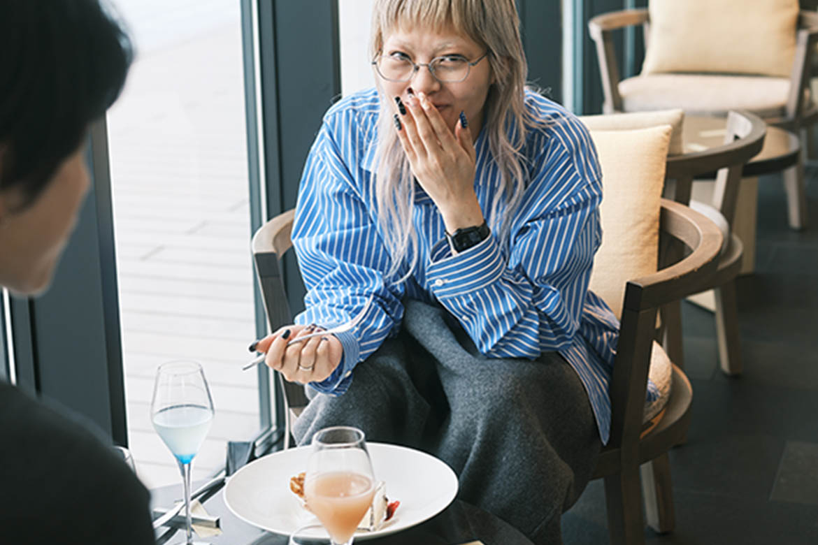 「おやつの時間だ~!」とワクワクした気持ちで、ドリンクを注文。松葉さんは「ソラノレモネード」、長谷川さんは「白桃ベイビーベリー」をセレクト。ノンアルコールのドリンクも充実しているのが嬉しい!